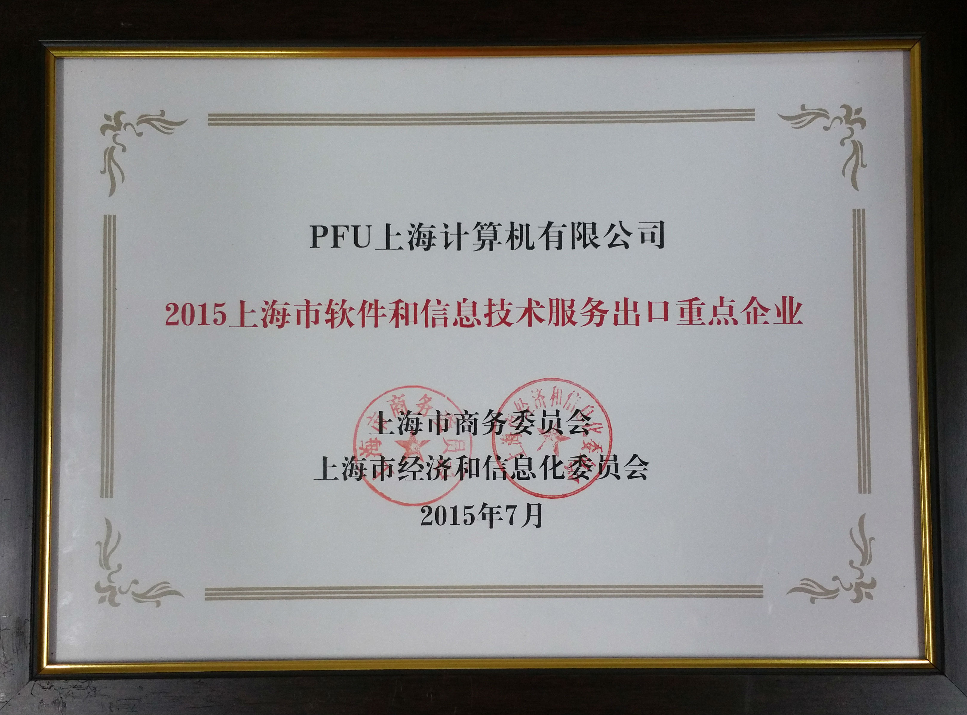2015年10月22日,由上海市人民政府主办,上海市商务委员会、上海市经济和信息化委员会等共同承办的第十三届上海软件贸易发展论坛在沪举行。本届论坛的主题是“软件助推创新服务引领未来”,国内外知名企业总经理和专家学者发表了主旨演讲、进行了圆桌对话。论坛还公布了经市商务委、市经信委评审认定的上海市软件和信息技术服务出口24家重点企业名单,并颁发了证书,PFU上海榜上有名。